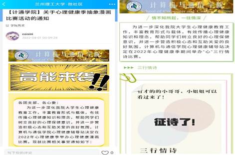 为激发同学们对美好生活的向往,心理健康辅导站开展了《“心”三行情诗征集》活动,鼓励同学们用简单的文字来抒发心意,征集作品展现了青春时代的懵懂爱意、对友情和亲情的理解,感叹时光飞逝等,丰富同学们的内心世界;执笔画心,以画抒情,开展《心理健康季抽象漫画征集》活动;同时在易班App发起“寻找春天的踪迹”摄影大赛,鼓励同学们去发现身边的美,用心感受春天的生命力。