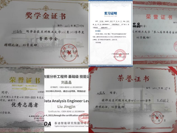 学习方面:严谨认真、刻苦努力,专业课成绩均在85分以上,大一学年加权平均分92.46,位于专业第二,综合测评成绩位于专业第二。荣获校级一等奖学金和校级“三好学生标兵”称号。奋发向上、不骄不躁,积极参加学科竞赛和创新创业比赛,获得数学竞赛省三等奖,大唐杯铜奖,三创赛铜奖,数学建模校二等奖等。积极进取,曾在广东泰迪智能科技股份有限公司大数据事业部部门实习数据分析师一职,期间完成所有项目任务,成绩表现优秀。