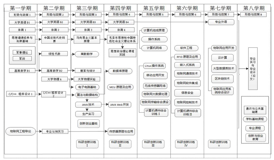 计算机网络、操作系统原理、计算机组成原理、数据库原理、信号与系统、物联网通信技术、传感器原理与应用、无线传感器网络、MCU原理及应用、Linux操作系统、嵌入式系统、JAVA技术、云计算技术、移动应用开发、物联网软件集成技术、物联网应用系统与开发等。