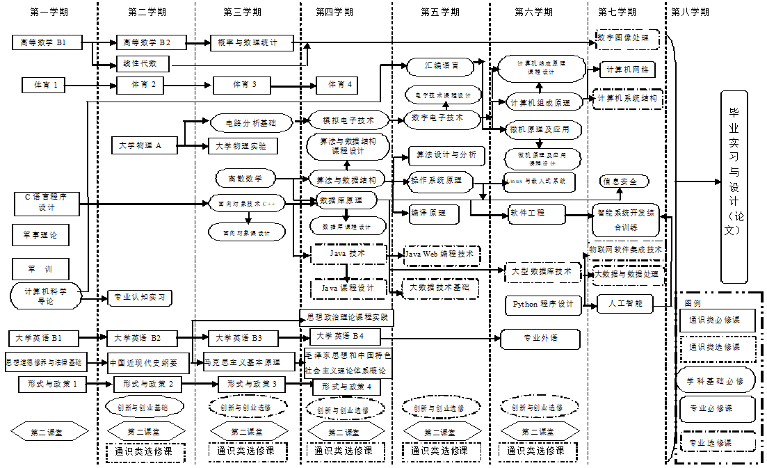 离散数学、电路分析基础、电子技术基础、微机原理及应用、计算机组成原理、算法与数据结构、操作系统原理、计算机网络、面向对象技术(C++)、数据库原理、软件工程、嵌入式系统、人工智能、大数据技术基础等。