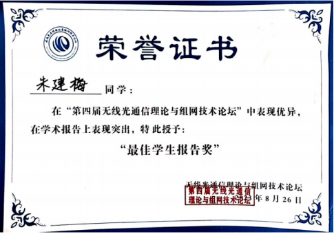 经组委会评选,朱建梅硕士的分组报告被评为“最佳学生报告奖”,并于现场颁发证书及500元奖金。