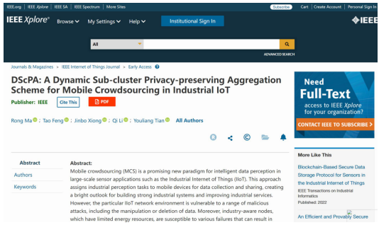 网络与信息安全团队的马蓉博士在国际权威期刊<IEEE Internet of Things Journal>(影响因子:10.6)发表了题为“DScPA: A Dynamic Sub-cluster Privacy-preserving Aggregation Scheme for Mobile Crowdsourcing in Industrial IoT”的研究成果。冯涛教授为通讯作者,马蓉博士为第一作者。
