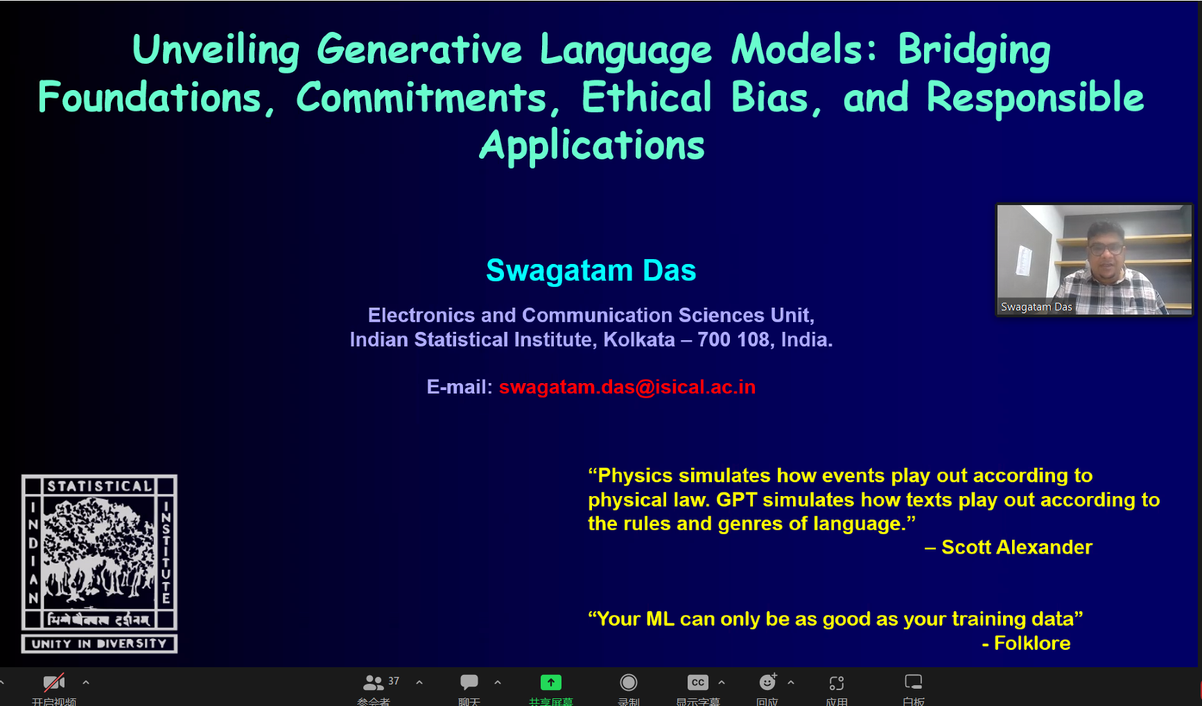 赵付青教授邀请,印度统计研究所Swagatam Das教授在线做了“Unveiling Generative Language Models: Bridging Foundations, Commitments, Ethical Bias, and Responsible Applications”学术报告,色情av影片