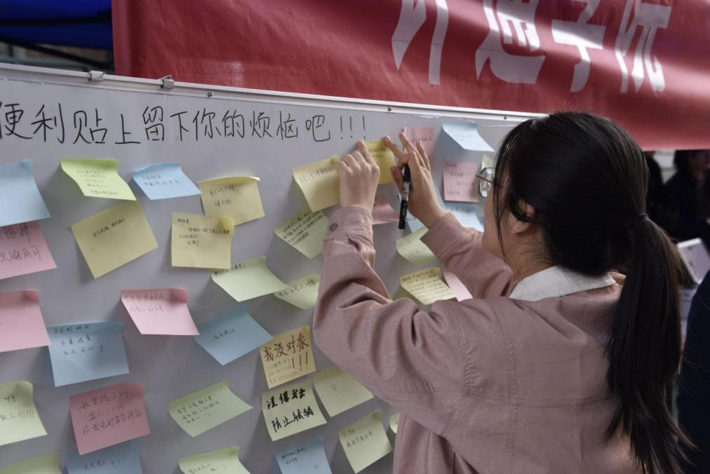 活动期间,参与者在便签上写下自己当前的焦虑、烦恼或想要分享的心情,并贴在心理展板上。随后,他们可以领取一张空白明信片,在上面留下温暖的留言,为下一位参与者传递正能量。最后,参与者将随机抽取一张留言明信片,并可在现场领取盲袋礼物一份。