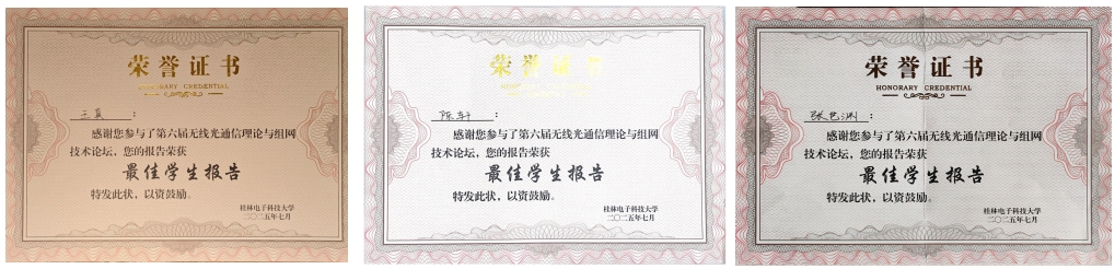 无线光通信与传感技术团队的硕士生张世渊和宁城也分别作了学术报告。硕士生张世渊在《IAPO-ELM神经网络支持下的室内可见光定位方法》报告中,针对传统室内可见光定位精度低的问题,提出了一种改进北极海鹦搜索算法优化的极限学习机方法,并结合加权K近邻算法,成功实现了低延时、高精度的定位,满足多场景需求。硕士生宁城在《FTN-MIMO无线光通信中的深度学习端到端系统设计》报告中针对无线光FTN-MIMO系统中的复杂干扰问题提出了一种解决方案,通过引入LSIM-ReNet自编码器,有效消除了干扰。此外,博士生王真、陈轩、硕士生张世渊,荣获“最佳学生报告奖”。