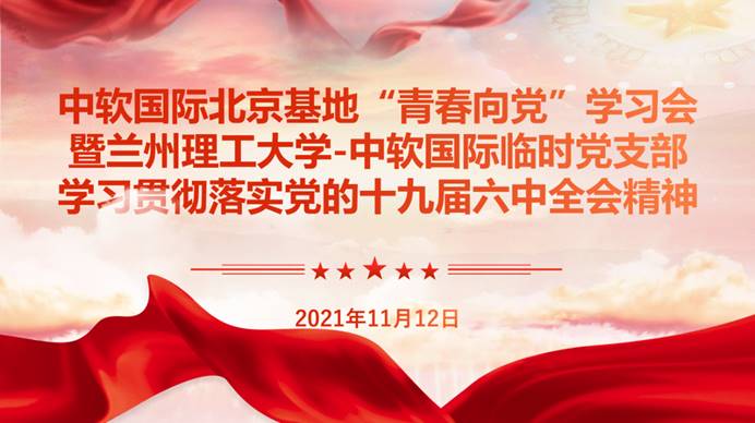 —中软校企联合临时党支部所有正式党员、预备党员和入党积极分子召开了“中软国际北京基地青春向党学习会”,会议由北京基地教务部经理顾娈鸾主持,向临时党支部所有成员宣贯了党的十九届六中全会内容,并共同观看了中共中央举行的新闻发布会。新闻发布会引起了强烈反响和积极共鸣,发布会后全体成员积极讨论,进一步理解和感悟党十九届六中全会精神,并由党员代表发表感言,积极响应党中央的号召,以求真务实、开拓创新的精神,牢记初心使命,为实现中华民族伟大复兴的中国梦贡献青春力量!