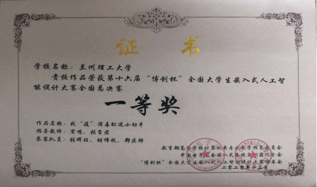 经过组委会专家最终评选,有90支队伍入选全国总决赛。总决赛为线上评审,主要内容包括设计报告、PPT、作品演示视频及讲解,通过专家组对作品的综合评审,代表我校参赛的十支队伍,分别获得一等奖1名,二等奖3名,三等奖6名。其中由宋鸣、张玺君指导的《战疫消毒配送小助手》获得了一等奖。
