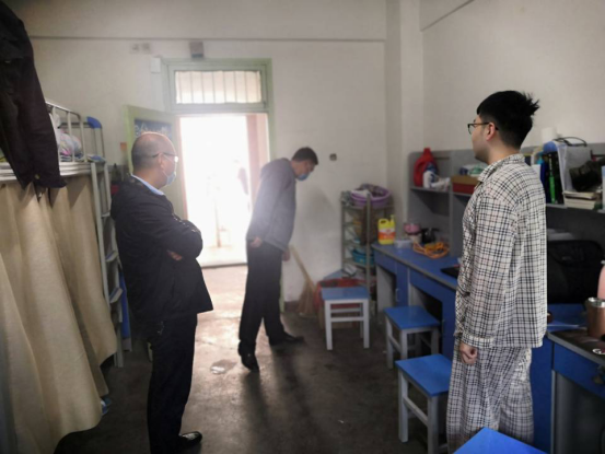 党委书记曾贤虎、副书记白杨、辅导员武彦伟,深入学生宿舍,看望慰问返校学生,并与学生亲切交流。