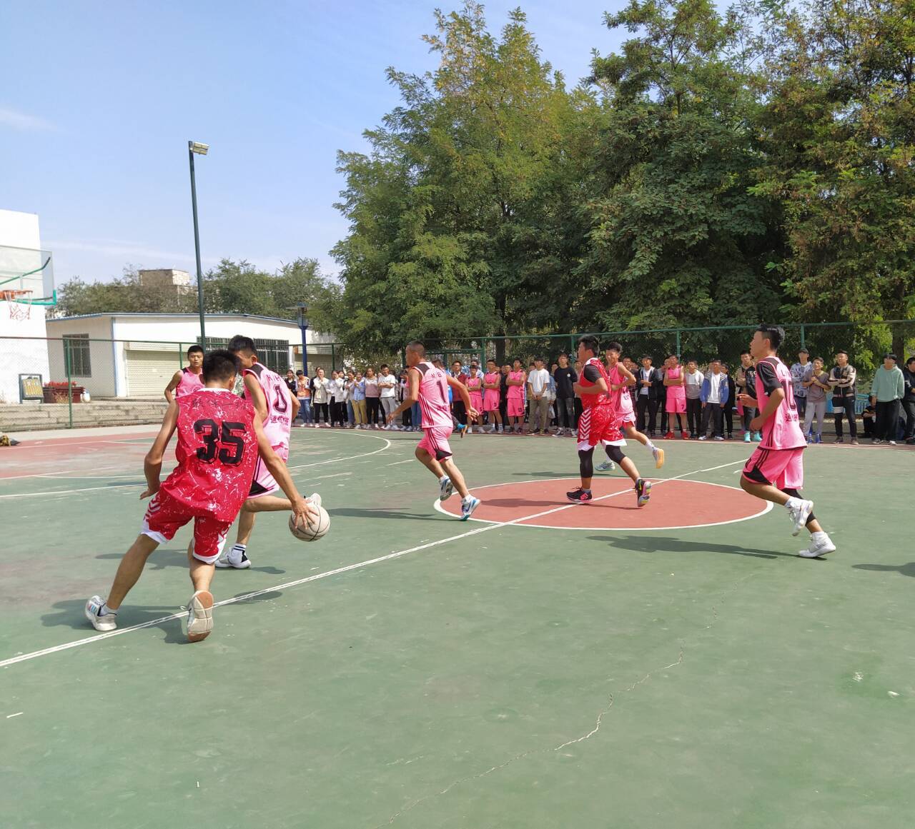 本次总决赛前,球员们个个斗志昂扬。待所有参赛队伍及相关工作人员都到达篮球场后,伴随着裁判员的一声哨响,总决赛正式开始。随着比赛的进行,现场气氛急剧攀升,双方很快进入了激烈的角逐,同学们不惧炙烤着大地的艳阳,即使额头布满了汗珠,他们依旧生龙活虎,个个激情四射,一轮轮的抢球动作灵活,漂亮的投球更是帅气利落。每个动作都流畅自如,场内角逐激烈,场外气势高涨,啦啦队纷纷前来为自己班级加油助威。裁判也本着公平公正的原则,十分用心,努力判决好任何一个球。呐喊声此起彼伏,与球场上裁判的口哨声构成了一首完美的交响乐。它洋溢着青春的气息,张扬着年轻的自豪。