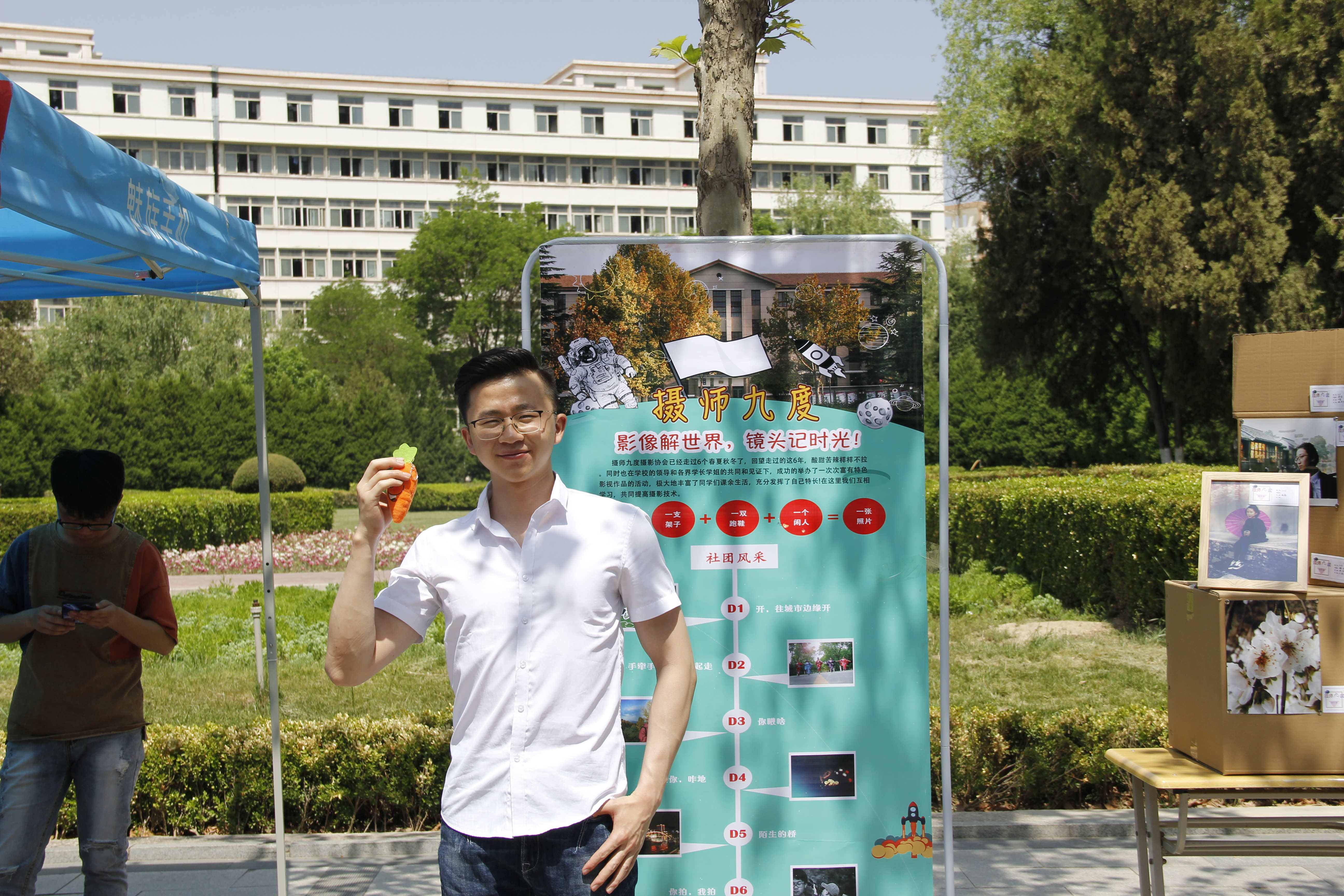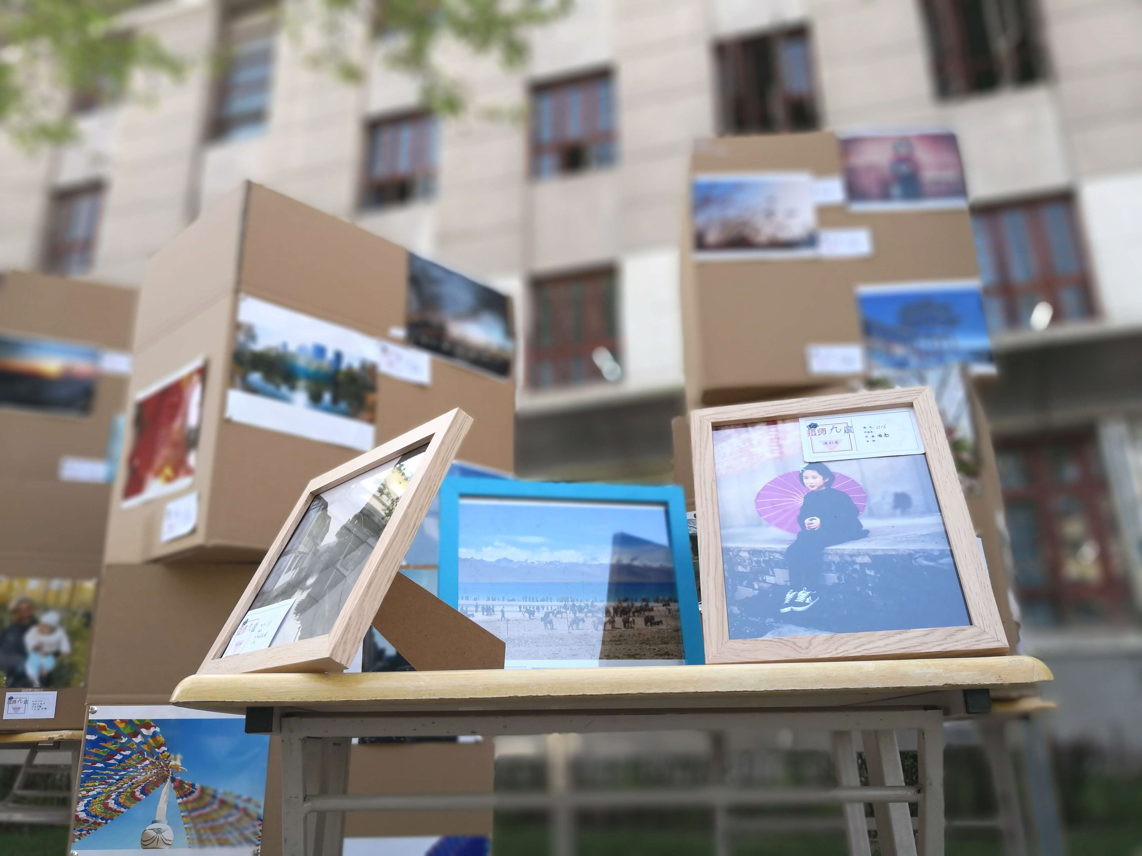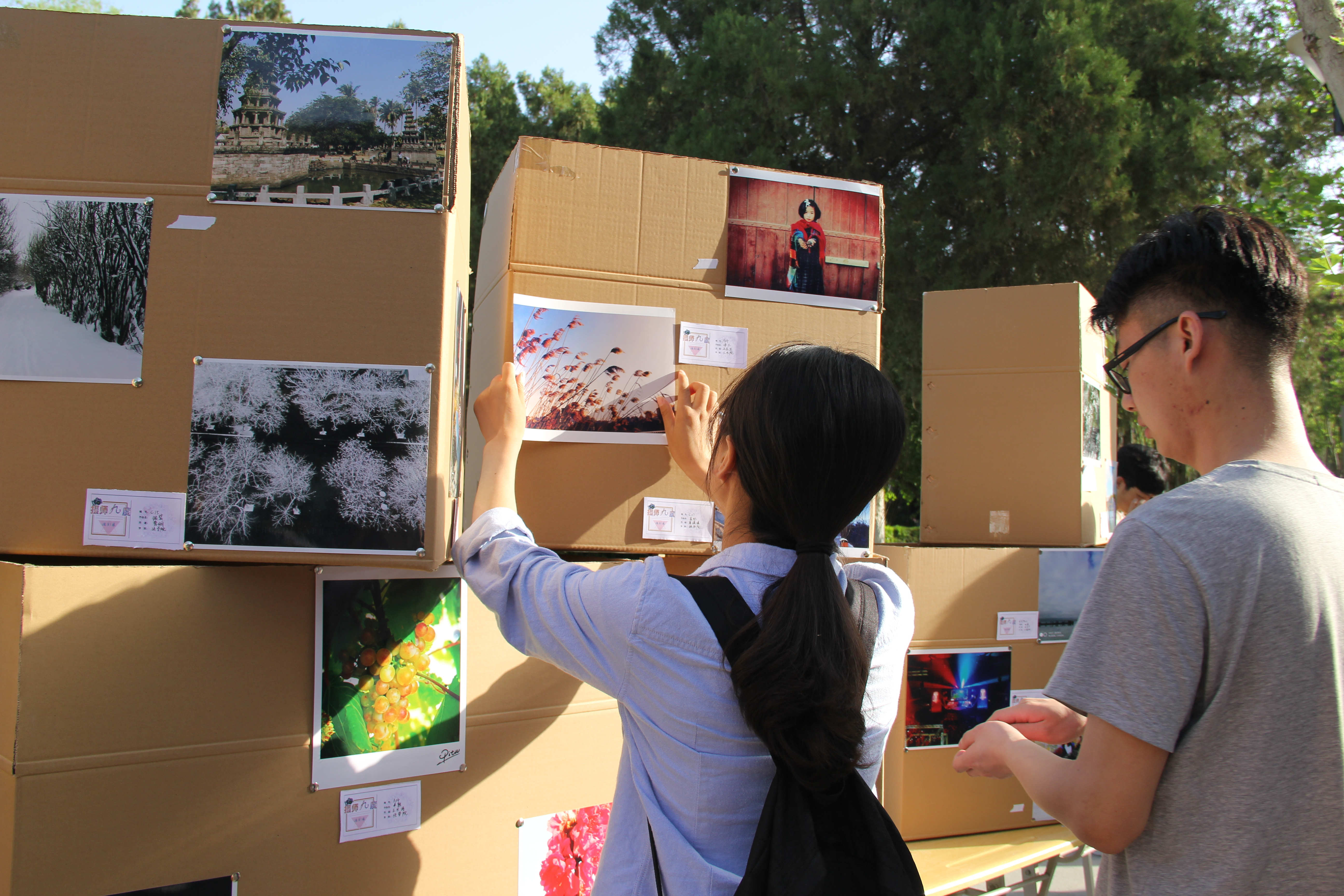 在这些纸箱子的间隙放着用相框装裱起来的各色照片,在木质相框的衬托下照片愈发精美。在这堆纸箱的两头,行道树的麻绳上同样挂着照片,这些挂在麻绳上的照片是社团历届摄影展的作品,本次摄影展特设此专区回顾过去。