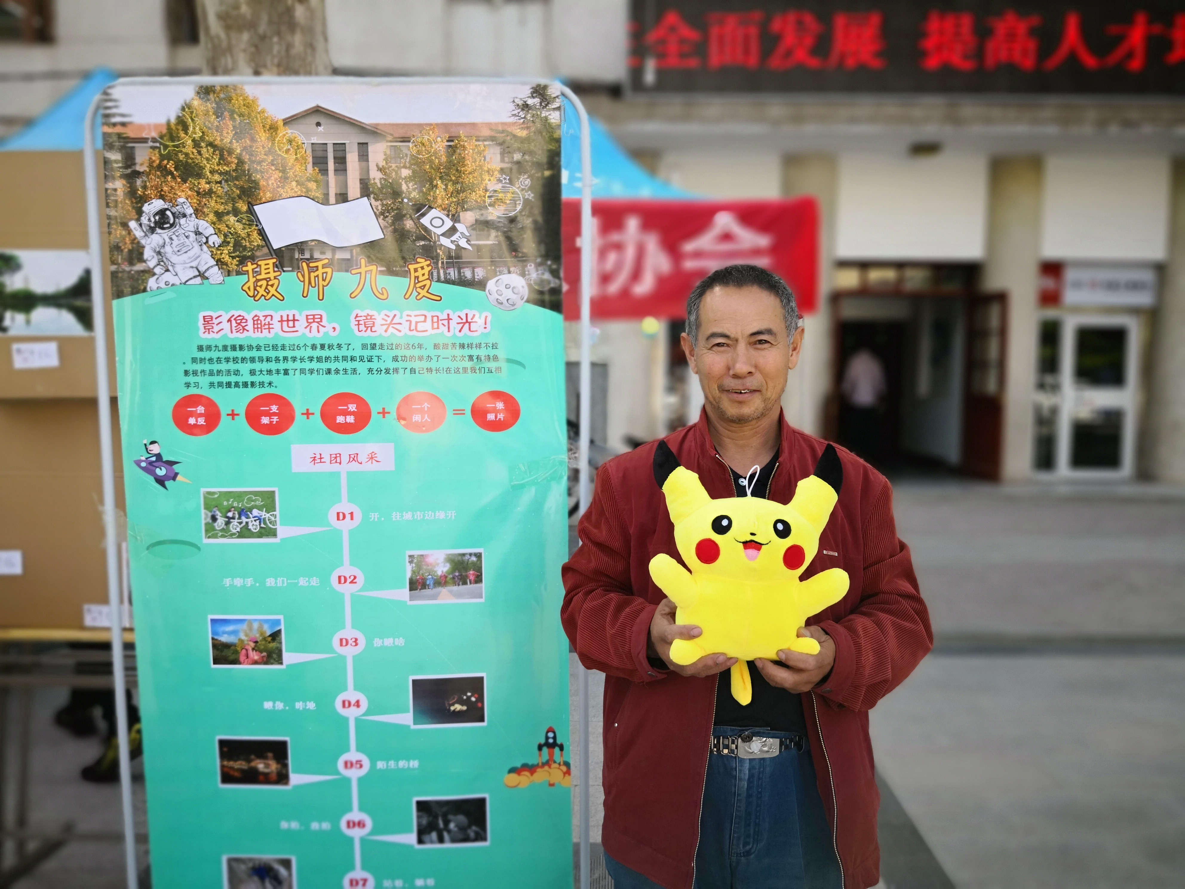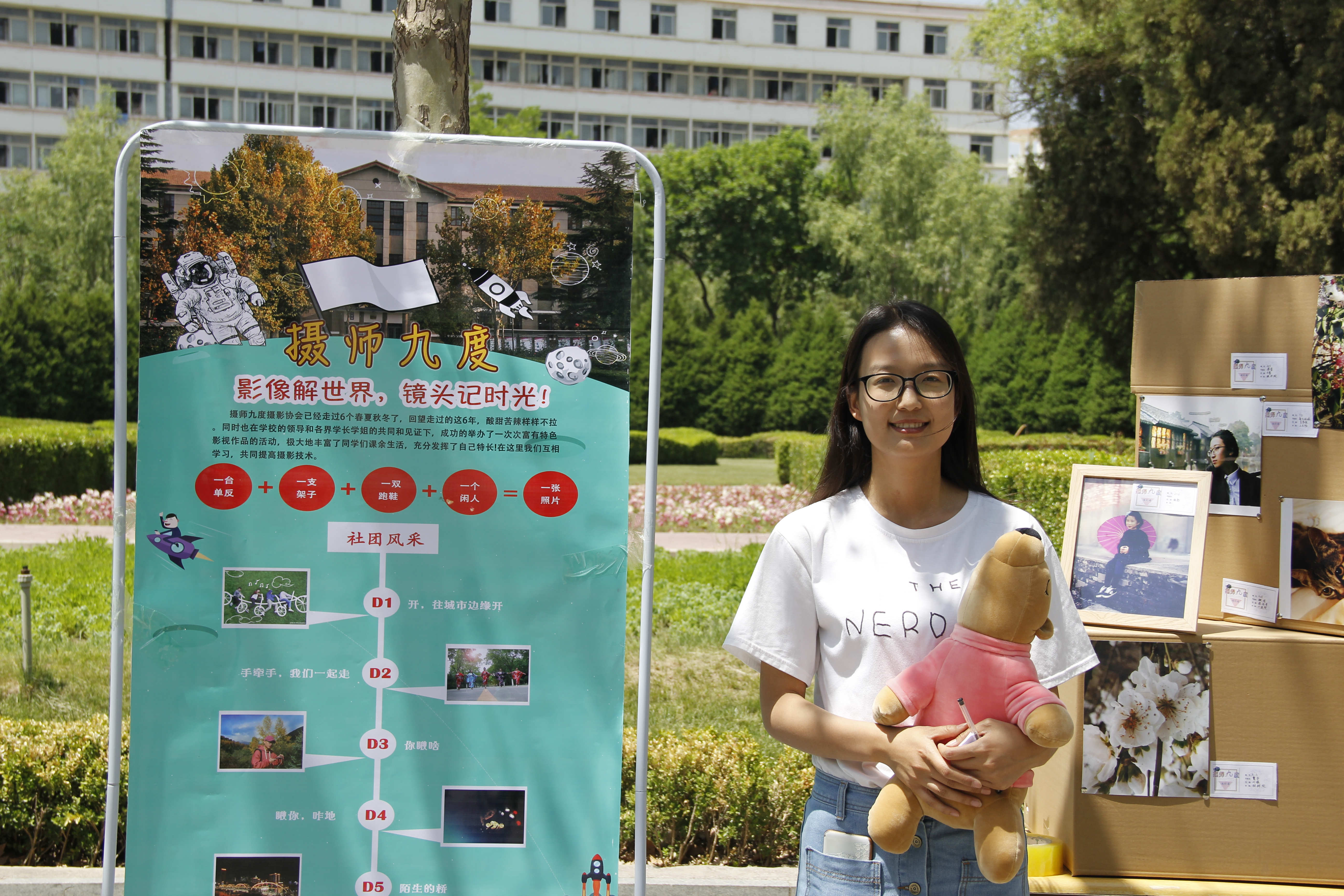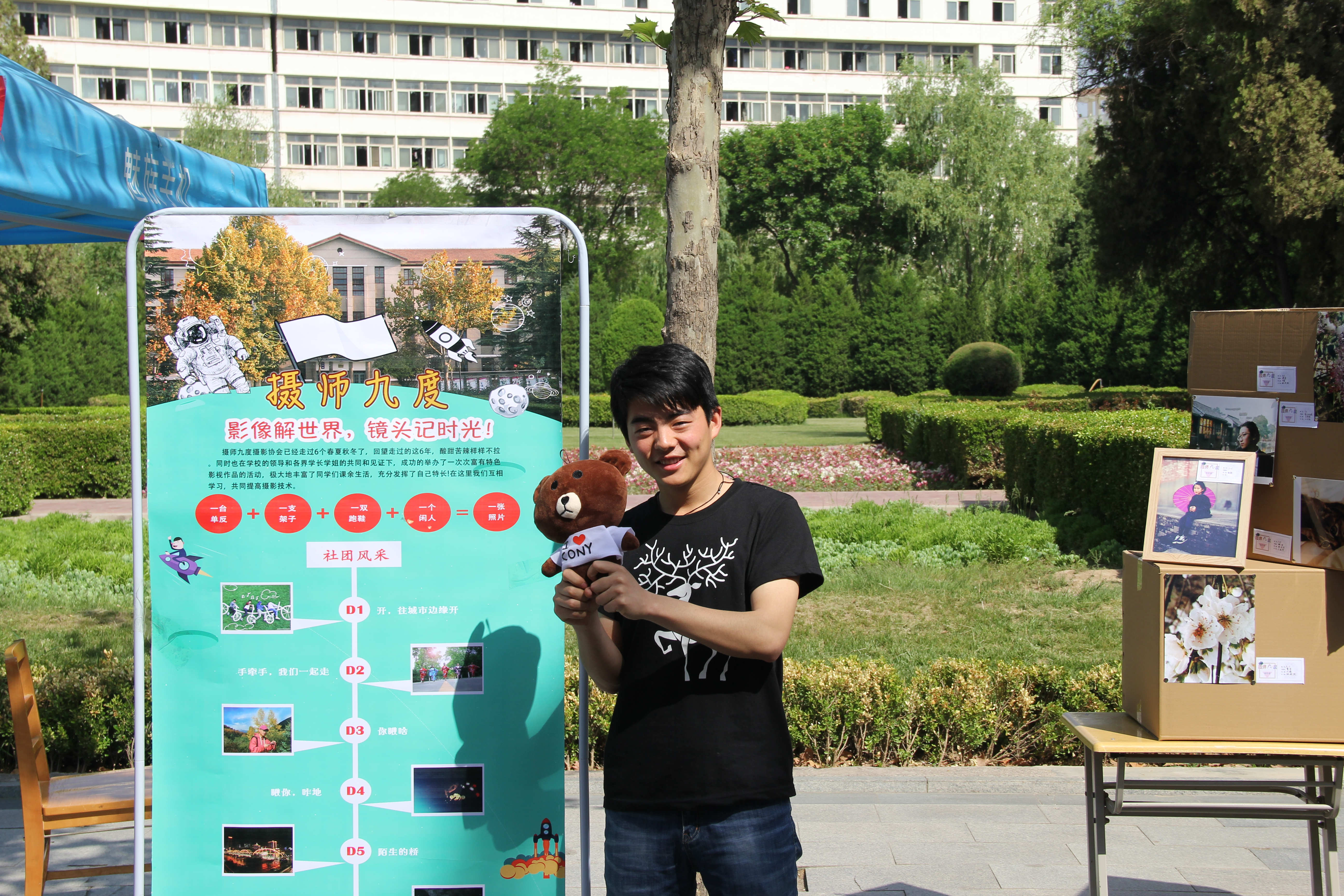 在这些纸箱子的间隙放着用相框装裱起来的各色照片,在木质相框的衬托下照片愈发精美。在这堆纸箱的两头,行道树的麻绳上同样挂着照片,这些挂在麻绳上的照片是社团历届摄影展的作品,本次摄影展特设此专区回顾过去。