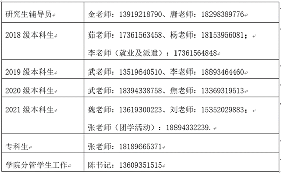 关于疫情期间学生生活学习,家长可按下表联系辅导员老师(紧急事宜打电话,一般事宜请发短信。非常时期老师都特别忙,请家长予以理解):